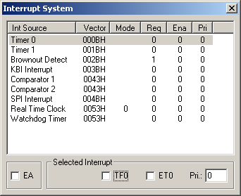 The Interrupt System dialog (available from the Peripherals menu) displays the status of all simulated MCU interrupts. The interrupt source, vector address, mode, request, priority, and enabled status are displayed. You may use this dialog to manually change the interrupt configuration. Select the desired interrupt and click on the desired check box to immediately effect the change. You may even trigger an interrupt by clicking on its request bit. You may trigger an external interrupt by toggling the appropriate port pin. External interrupt 0 is triggered by either a changing edge or level on I/O PORT 1.3. You can change the state of the pin by writing to the PORT1 VTREG. The following assignments may be entered in the command window to toggle PORT 1.3. PORT1 ^= 0x08 // Toggle PORT 1.3 PORT1 ^= 0x08 // Toggle PORT 1.3 These commands toggle the state of PORT 1.3 and then toggle it back. | ||||||||||