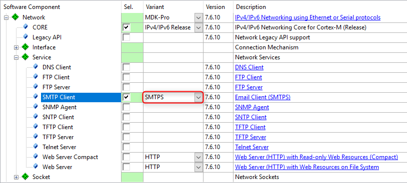 Net_Security.c to the project which contains an empty CA certificate. To define it, follow the steps provided in Adding server root CA certificate.mbedTLS_Config.h configuration file with the following (a copy named mbedTLS_config_SMTPS.h is available in the Template folder): startup_xxx.s and set TLS_THREAD_STACK_SIZE in TLS_mbed.c (default is 4096)The SMTPS service of the Network Component adds the Net_Security.c file to the project. This file contains an empty section for the e-mail server root CA certificate, so you cannot initially build the application. You must provide a valid root CA certificate for the server that you use to send e-mail. The certificate must be provided in PEM-encoding. Copy the contents of the certificate into the NetSecurity_EmailServerCA structure in Net_Security.c and add a leading " and a trailing \n" to each line.